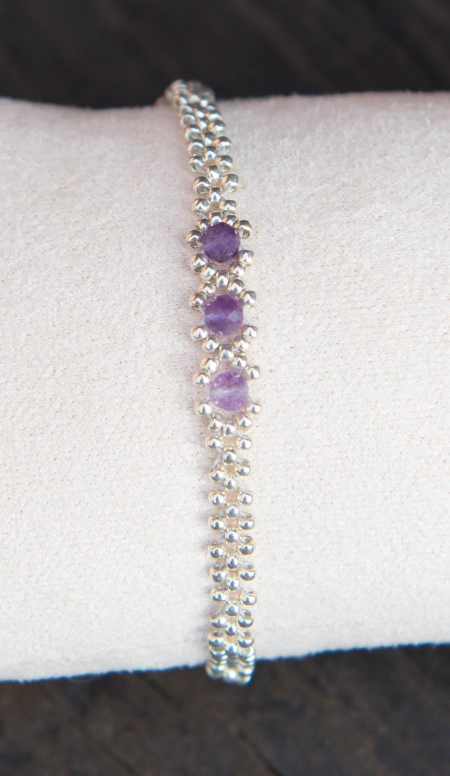 Bracelet réalisé avec un tissage de fines perles argentées de 2 mm et d'un serti de perles en améthyste facettées.