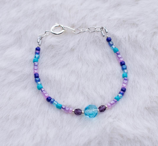 Fin bracelet composé de perles de rocailles et perles en verre turquoise violet mauve.